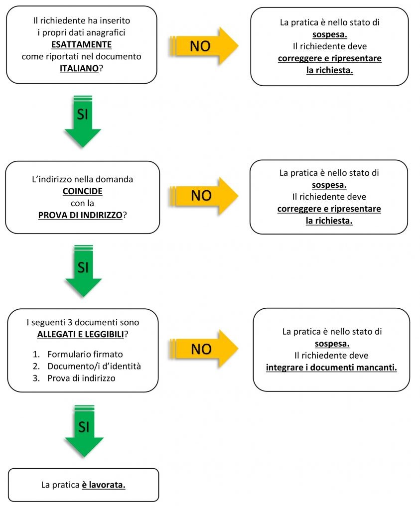 - Verifica la corrispondenza dell’indirizzo estero inserito nella richiesta con la prova di indirizzo inviata e controlla se la documentazione richiesta è completa;